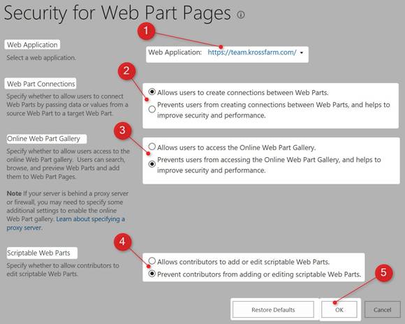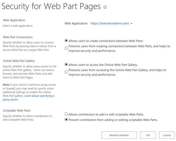 - Online Web part gallery- Select allows the users to access the Online Web part gallery or prevents the users from accessing the Online Web part gallery and helps to improve security and performance.