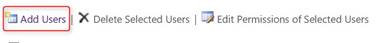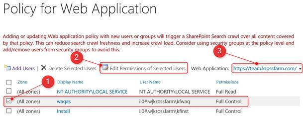 - On Policy of Web Application page, select the correct Web Application (3), select the User (1), click Edit Permissions of the selected users (2).