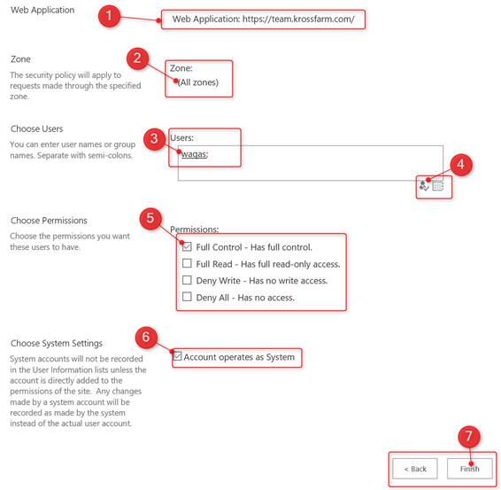 System Account- Sometimes you don’t want to show the account’s information to the end user to avoid any information leak or any information leak about the enterprise Service accounts. Thus, select this system account option, when you add a user into Policy for the Web Application, then account is displayed as SharePoint\System regardless of its name & details.