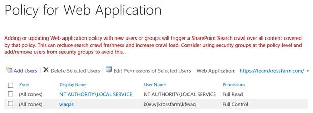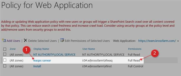 - Now, you will see the Waqas is added as a full control in all zone for the team Web Application.