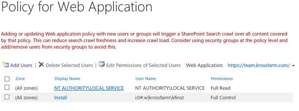 Policy of the Web Application is in a centralized location, where we can manage the permissions for the Web Application. There are a couple of different level of permissions, you can assign it to a single user or a group.