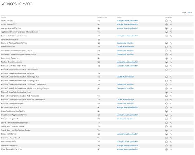 When you click on the Manage Services in this farm link, you will land on the Services in the Farm Page. This page will give you the information about the Services in the Farm. With the release of MinRole, this page contains more information.