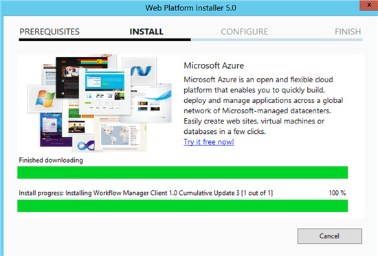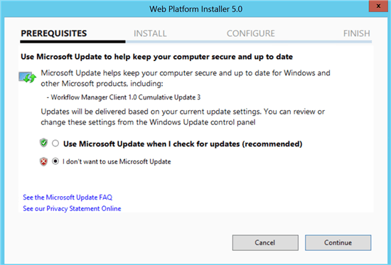 After configuring the Workflow Manager 1.0, now I have to Install the Workflow Manager Client 1.0 CU 3 on all the SharePoint Servers. Workflow Manager Client is the key component which should be available on all SharePoint servers. Workflow Manager Client 1.0 and Workflow Manager Tools 1.0 for Visual Studio 2012 contain core assemblies, activities, and client APIs used to develop and run Workflow Manager 1.0 applications. This is a very important component of the Workflow Manager, if we miss it then workflow will fail with unexpected errors. Note If workflow manager is already installed on the server then there is no need to install the Workflow Manager Client on the server as it is already installed on the server (part of the Workflow Manger). Let’s start the installation Process of the Workflow Manager Client 1.0 CU 3.