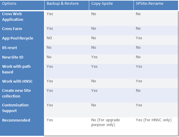 As we can see, only the backup & restore method is nice, clean, and works with complex site collections. This method also offers the flexibility to move the site collections between web applications and farms. The rename method is also great but due to web app limitation, we put it down the list. Copy-SPSite is only for the upgrade process and verification, and not intended for day-to-day use.