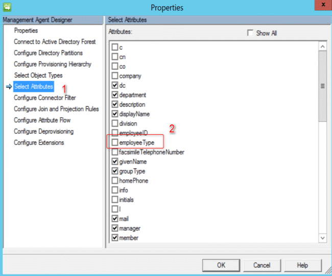 - On the Properties pop-up, click on the "Select Attributes" under the Management Agent Designer. In the Select Attributes, check the required Attributes (Employee Type and UserAccessControl). Now, click OK.
