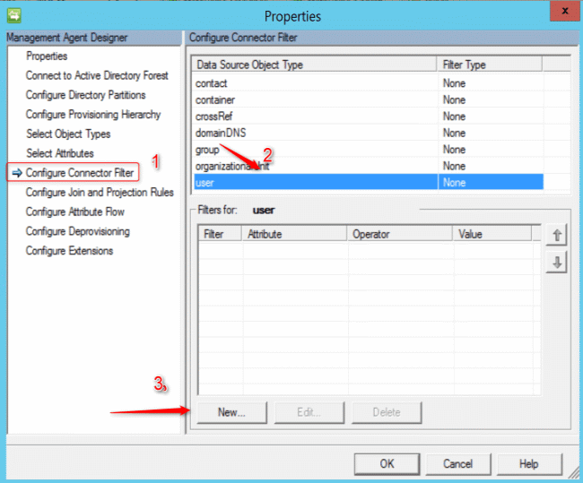 - Now, select the Configure Connector filter (1) >> User(2) >> click on New (3).