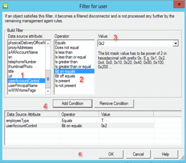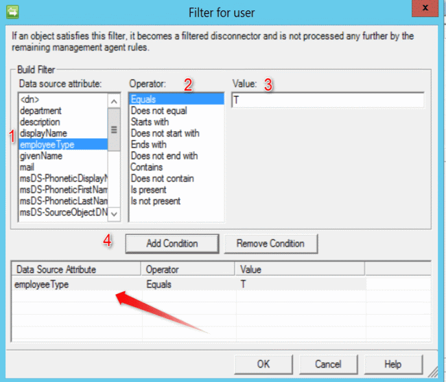 - In the "Filter for User" window, in "Data source attribute" section, click on Employee Type, >> Equals. Then, under Value section, put the value T. Now, click on "Add Condition".