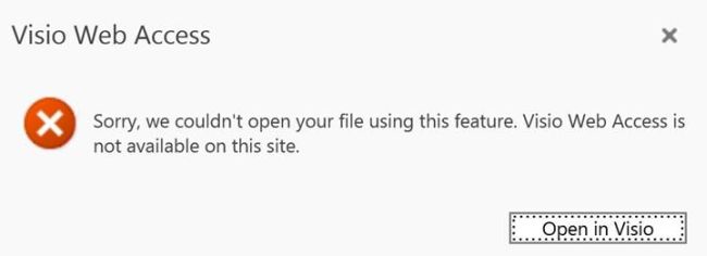 If you upload a fresh Visio diagram to the SharePoint and click it and you will get the error, as shown below.