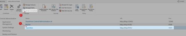 - Highlight the Web Applications and click Service Connections from Ribbon.