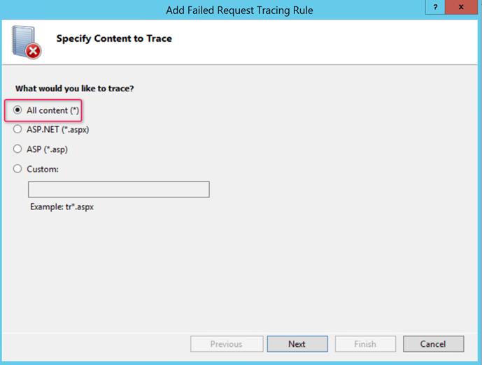 - In the "Specify Content to Trace" area of the Add Failed Request Tracing Rule dialog box, select AllContent (*).