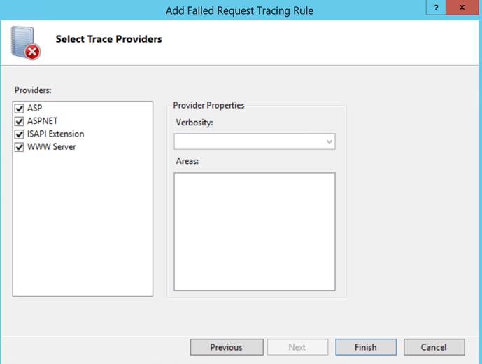 - In the "Select Trace Providers" area of the Add Failed Request Tracing Rule dialog box, I select All.