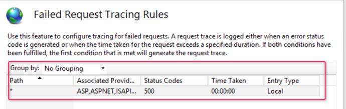 - In the "Define Trace Conditions" area of the Add Failed Request Tracing Rule dialog box, check the Status Code(s) and enter the HTTP Error 500.