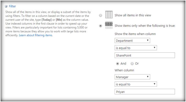 - Implement the filter conditions, using And/Or filters, so that only items that meet the condition will be shown in the view.
