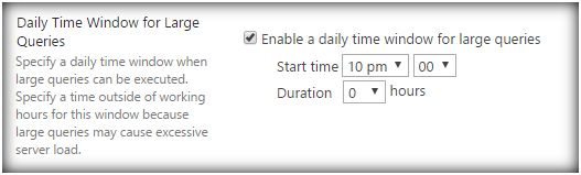 - You can set the daily time window for large queries from the Web Application->General Settings->Resource Throttling. Setting this outside the office working hours would provide a Window where queries that return large numbers of rows can be processed.