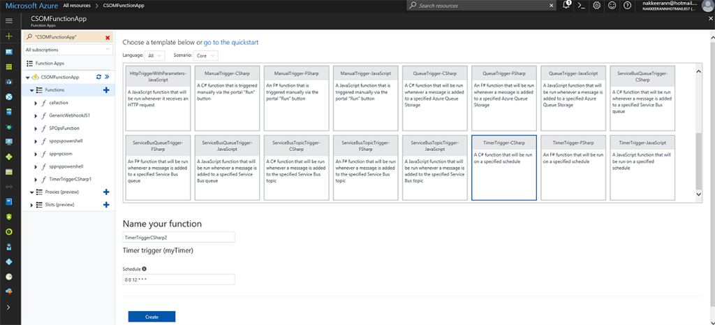 Once created, navigate to the app and create a Timer function. Here, choose TimerTrigger-CSharp option. Provide the name for the function. Specify the schedule details. Schedule has to be provided in the cron expression format. The format is given below to specify the schedule.