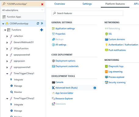 Once the function is created, navigate to the function main function app. Select platform features and advanced tool (Kudu).