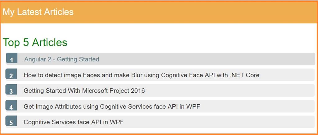 - { Id: 5, Title: 'Cognitive Services face API in WPF', Summary: 'In this article, I will explain how to use Cognitive Services face API in WPF.' }