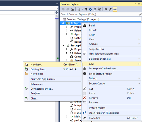 Now we will create a new Xaml page for getting data in listview. So Select TestApp (Portable) project -> right click -> select Add -> Select New item as shown in figure 2.