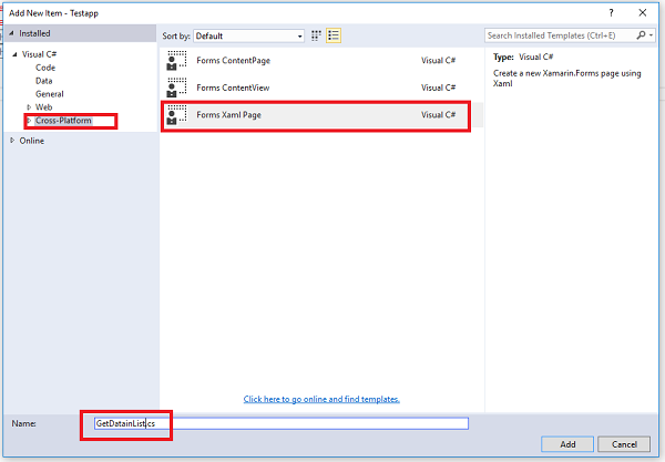 When you click a new item then dialog opens, select Cross-platform, then Forms Xaml Page and mention name GetdatainList. After that click Add button as in the following figure 3.