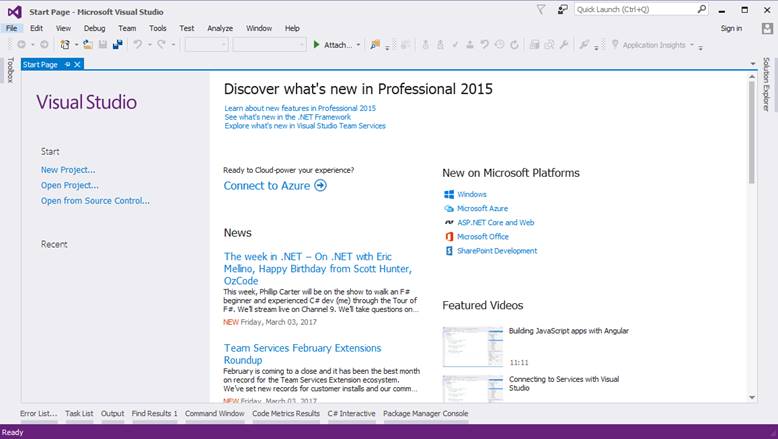Open Visual Studio IDE and click on "New Project" link. A "New Project" dialog will pop up.