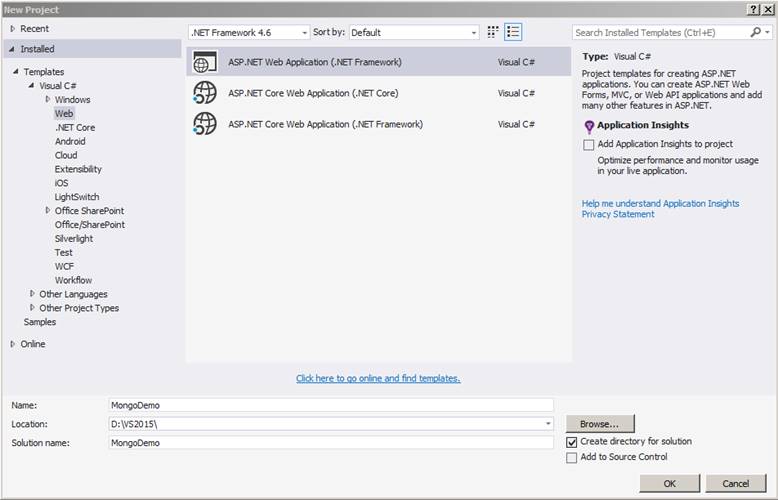 Inside that, from left pane choose templates ➜ choose Visual C# ➜ Web template. Then, in the middle pane, you will see the list of ASP.NET Web Application templates. Select ASP.NET Web Application (.NET Framework)" project templates.