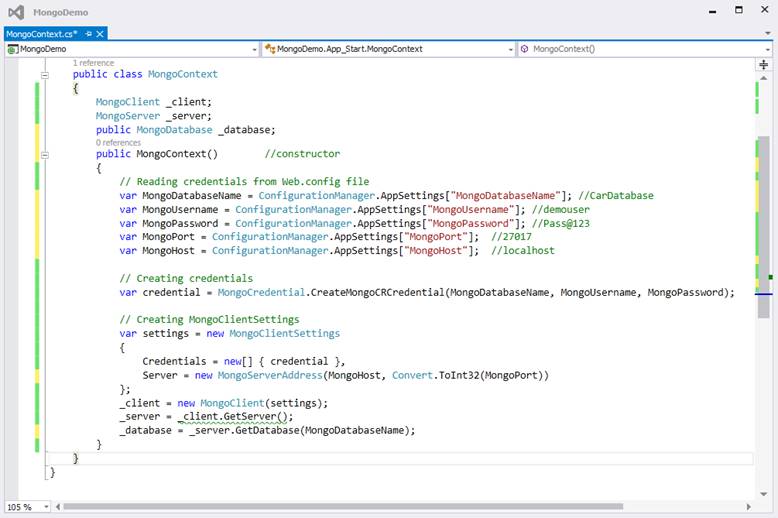 Then in the constructor of the class, we are getting values of Mongo Database from appSettings which we have set. Next we are passing these values to [MongoCredential.CreateMongoCRCredential] method for creating MongoCredential, and then in the next step, we are setting MongoClientSettings, for this setting we need to pass MongoCredential; along with that, we need to pass Host name and Port number of MongoDB.