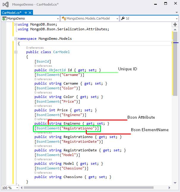 In this part we are going to add a model (a class) in Models folder with name “CarModel”, and properties inside CarModel are decorated with MongoDB attribute.