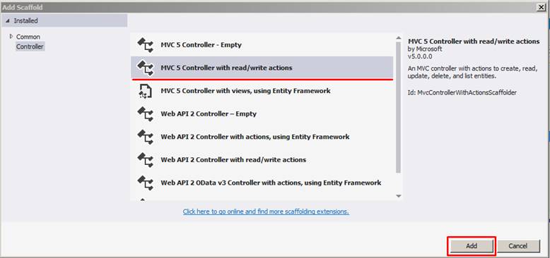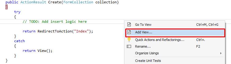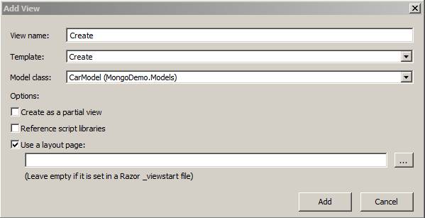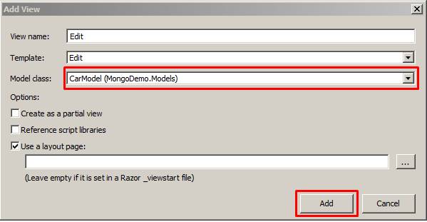 For adding view just right click inside Edit Action Method and choose Add View from the list of the menu. After choosing it a new dialog will pop up with the name Add View -- in this dialog just choose template “Edit” and Model class as “CarModel” click on Add button.