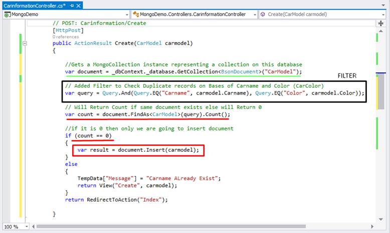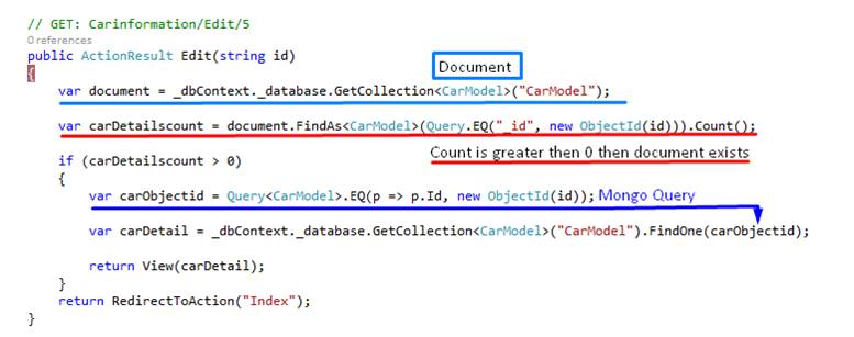 In the below snapshot we are first validating if the document already exists in the database or not by passing ObjectId and getting a count of the document if the count of the document is greater than 0 then the document exists after that we only get data for displaying in Edit mode.