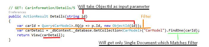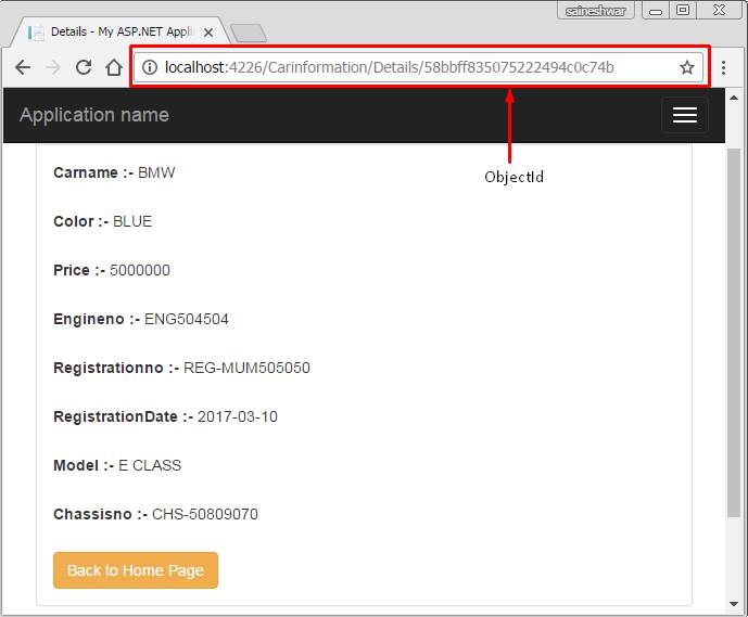 After clicking on Details button it will call Details Action Method which takes Objectid as input parameter and on basis of that parameter it gets data from MongoDB database to display data.