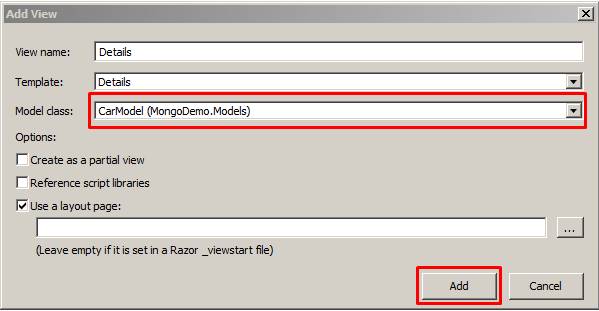 For adding view just right click inside Details Action Method and choose Add View from the list of the menu. After choosing this a new dialog will pop up with name Add View. In this dialog just choose template “Details” and Model class as “CarModel” click on Add button.