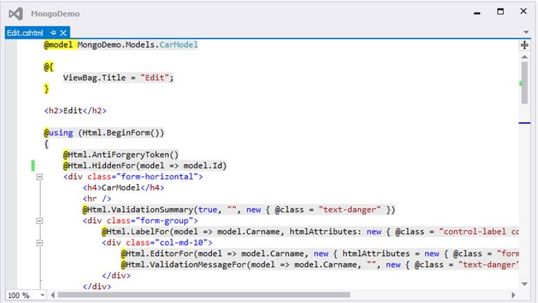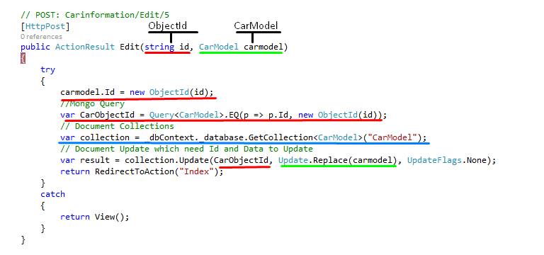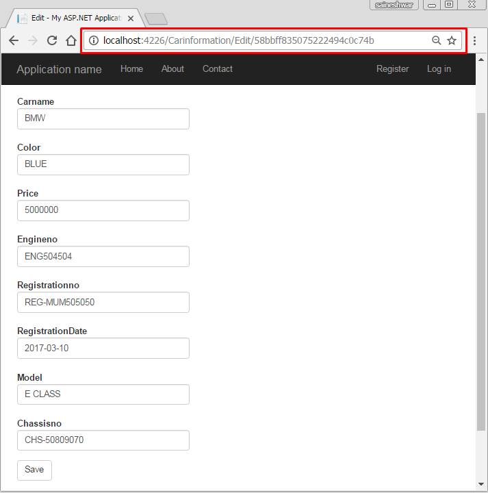 Now we have just shown data in edit mode now we need to write code for updating these values to MongoDB database on click of save button. For that, we are going to add another Action Method with same name Edit which will handle [HttpPost] Request.