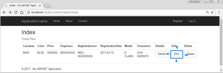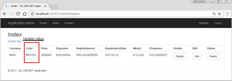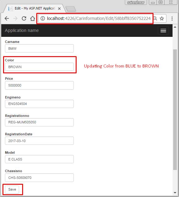 After clicking on Edit button you can see Edit view in Edit Mode. Now in this Mode we are going to update the Color of the Car from Blue to Brown and click on “Save” button to update values.