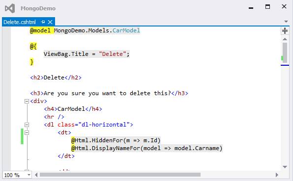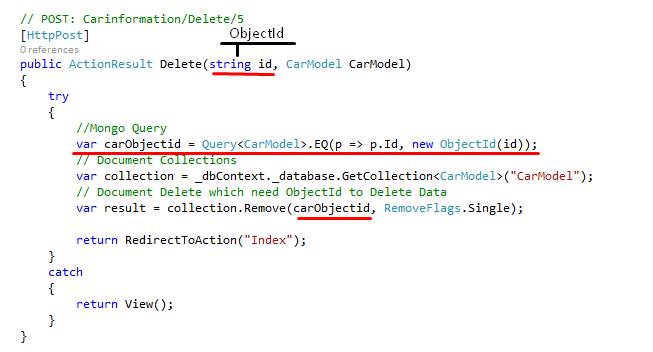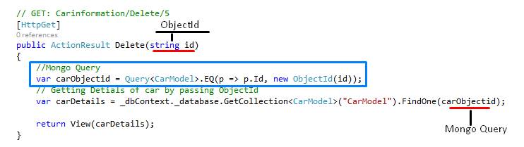 Now in this process we are first going to open index view from there we are going to click on Delete button then delete action method will get called which take Objectid as input parameter and then we are going to pass this parameter to create mongo query then this query will be passed to GetCollection method to get Car model data.