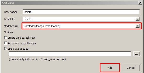 For adding view just right click inside Delete Action Method and choose Add View from the list of the menu. After choosing it a new dialog will pop up with name Add View in this dialog just choose template “Delete” and Model class as “CarModel” click on Add button.