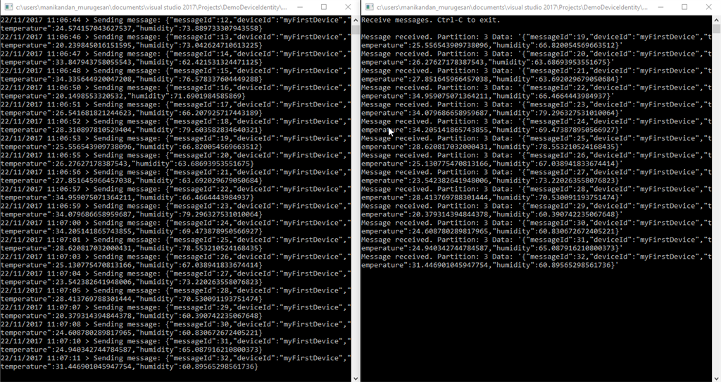 Press Start or F5 to start both the apps to Execute.The Console Output from the DemoSimulatedDevice displays the messages of our device app sends to the IoT Hub, and again the console output from the DemoReadDeviceToCloudMsgs app gets the message for the IoT Hub and shows as the Output.