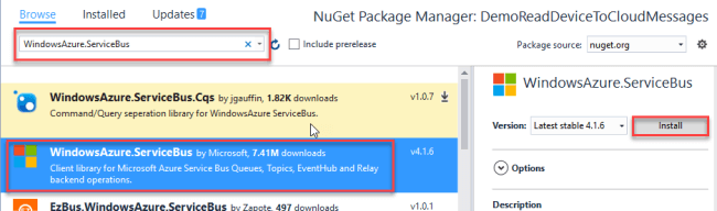 For our project, we need to add some packages. In the Browse window, search for the WindowsAzure.ServiceBus and press Install.