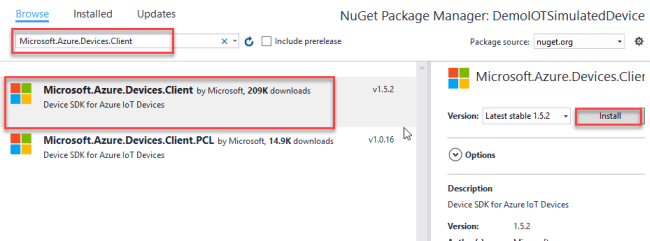 For this project we need some packages. Adding the required packages through the NuGet package. In browse field, search for Microsoft.Azure.Devices.Client and press Install.