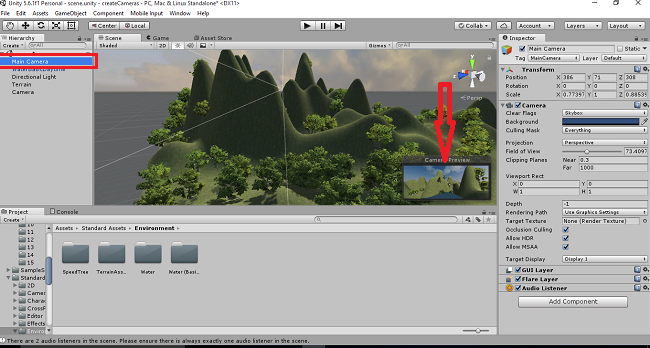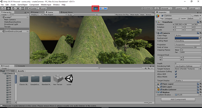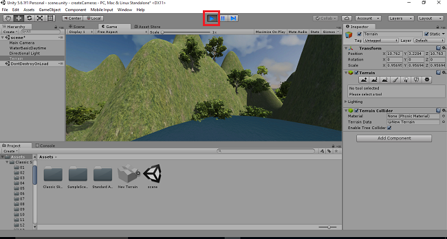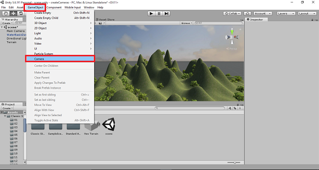Again, click on the Play button to come back to Scene View. Click on the Game object and select Camera.