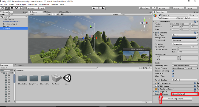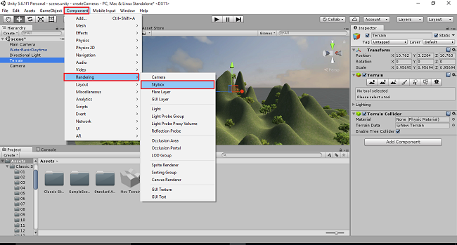 Camera is added in the Hierarchy View. Change the camera position. Select the Component menu in the menu bar, click on Rendering and pick the Skybox option.