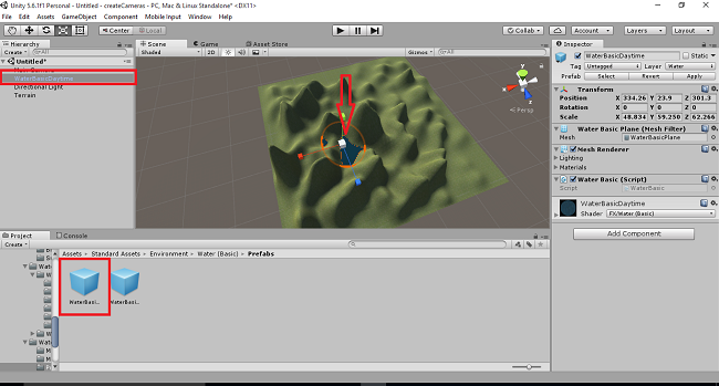 Click on the Standard Assets and select the Environment. Go to Water (basic) and select prefabs. Drag and drop the water. Then, select the scaling tool to increase & decrease the water length and width.