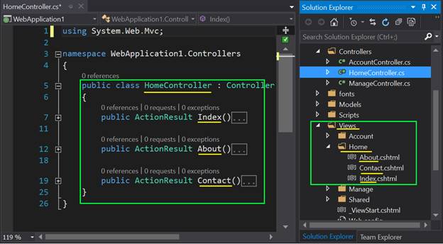 Views folder is known to have all the views, and convention tells Controller where to look for a View(s) associated with a controller action method. As shown in figure 2 below, each action method in Controller\HomeController refers to individual cshtml under “Views\<folder with controller name>”.