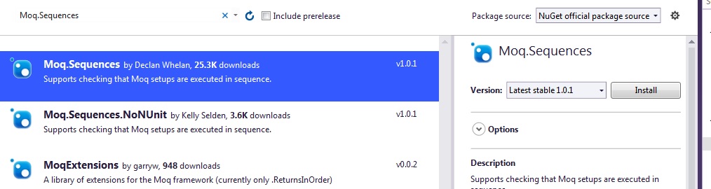 Download Moq.Sequences.dll from GitHub, followed by adding Moq.Sequences.dll as a reference in your .NET project and add a using Moq.Sequences; in your test class or simply use "Manage NuGet Packages” Manager, type "Moq.Sequences" and search for it. Finally, install it to your project and use it for your call as a reference.