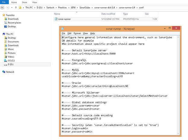 Open a new Windows Command prompt and navigate to the "D\Santosh\Practices\2016\SonarQube\sonar-runner-dist-2.4\sonar-runner-2.4\bin" folder and run "sonar-runner –h". This will show you the usage statement; if things are working fine.