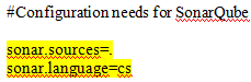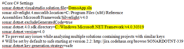 In sonar-project.properties file, you can find C specific settings, where you should configure the information like where the .sln file exists and which version of .NET; you are using and where the key libraries are located. The screenshot is given below for the reference.