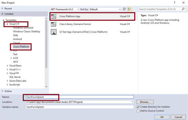 Open Visual Studio 2017 RC. Go to Start -> New Project-> Select Cross-Platform (under Visual C#->Cross Platform App-> Give suitable name for your app (XamFormSplash) -> OK.