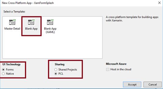 Select the Cross Platform template as Blank App, Set UI Technology as Forms, and Sharing as PCL.