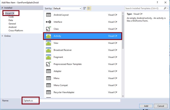 Select ->Visual C#-> Activity-> Give the relevant activity name (Splash.cs).