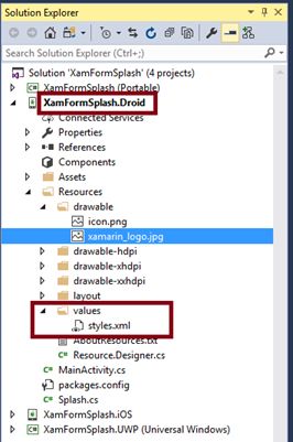 Add the splash screen image in XamFormSplash_Droid project Resources-> Drawable folder, and add the splash screen style to the Styles.xml in XamFormSplash_Droid project values folder.