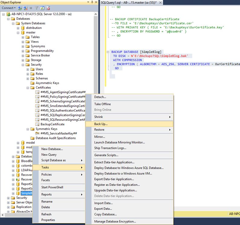 - Backup Encryption: SQL Server introduced yet another feature in SQL Server 2014 which is backup encryption as it supports database backups directly from backup engines. Now here in backup encryption, encryption is only done while taking backups and restoring backups (decryption with and key).